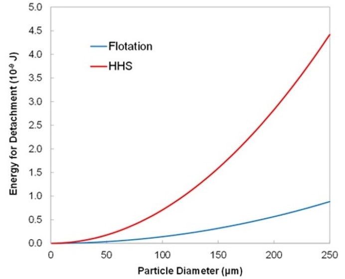 HHS becomes more selective as particle sizes become smaller. The following chart compares the detaching force of HHS on a hydrophobic particle to that of a flotation bubble. HHS’s superior attachment capability is the reason for its ability to recover ore particles that flotation has missed. It becomes more selective because liberation is better at finer sizes.