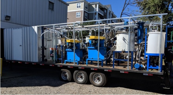 HHS is now ready for both lab and pilot plant testing of copper and other metallic ores. Below is a photo of MRC’s recently updated portable, HHS pilot testing unit. Rated at an output of 50-100 kg. of solids per hour, it is a small-scale version of the first HHS commercial plant, now under construction. The unit has been designed for testing on site or, more efficiently, by providing six-to-eight 50-gallon drums of slurry to MRC. This volume allows the plant to attain steady-state operating conditions.
